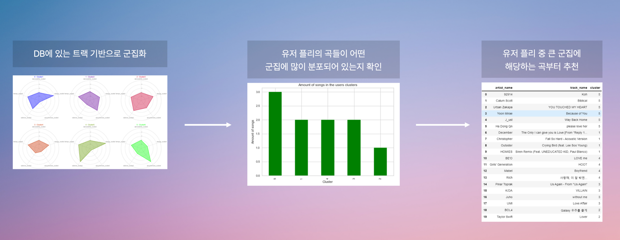 신곡이 들어왔을 때 유저 플리 내 군집 순서에 따라서 추천을 해줌.