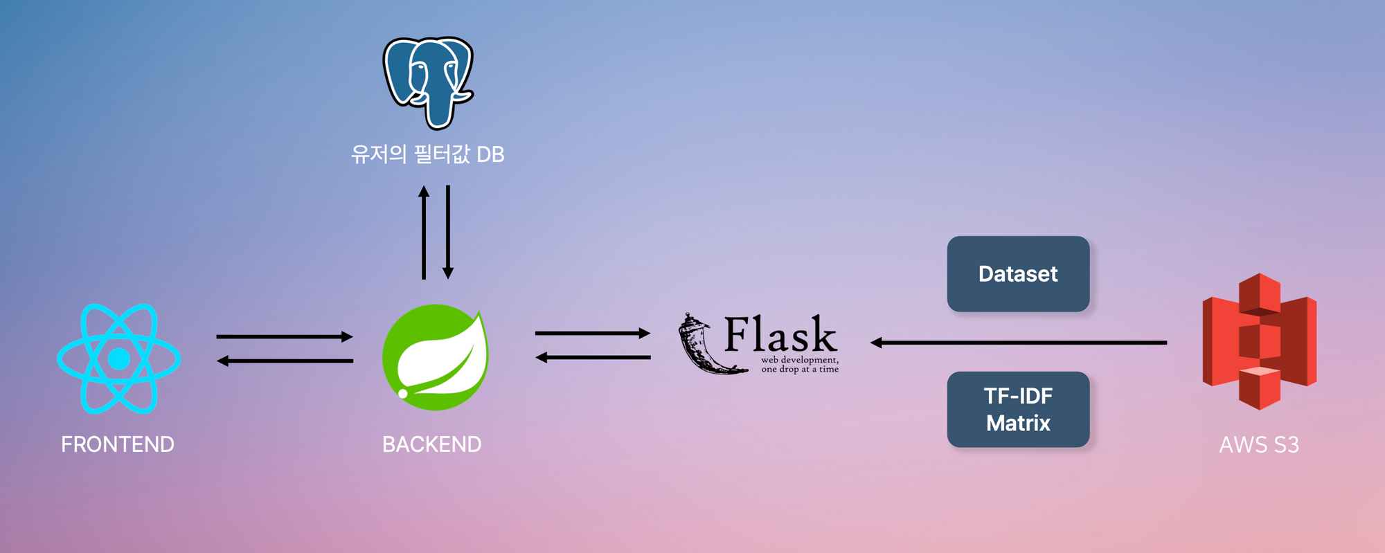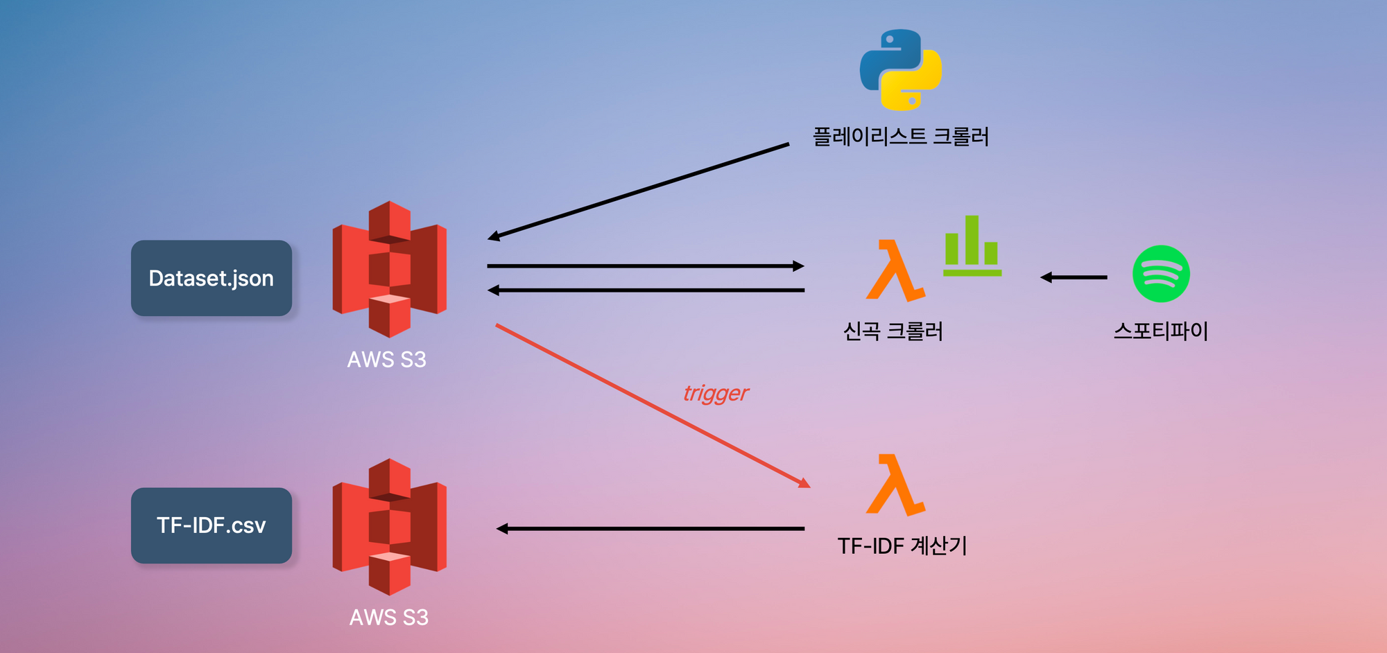 Flask 모델 서버는 S3에 저장된 Dataset과 Tf-Idf 매트릭스를 이용하여 곡을 추천한다.