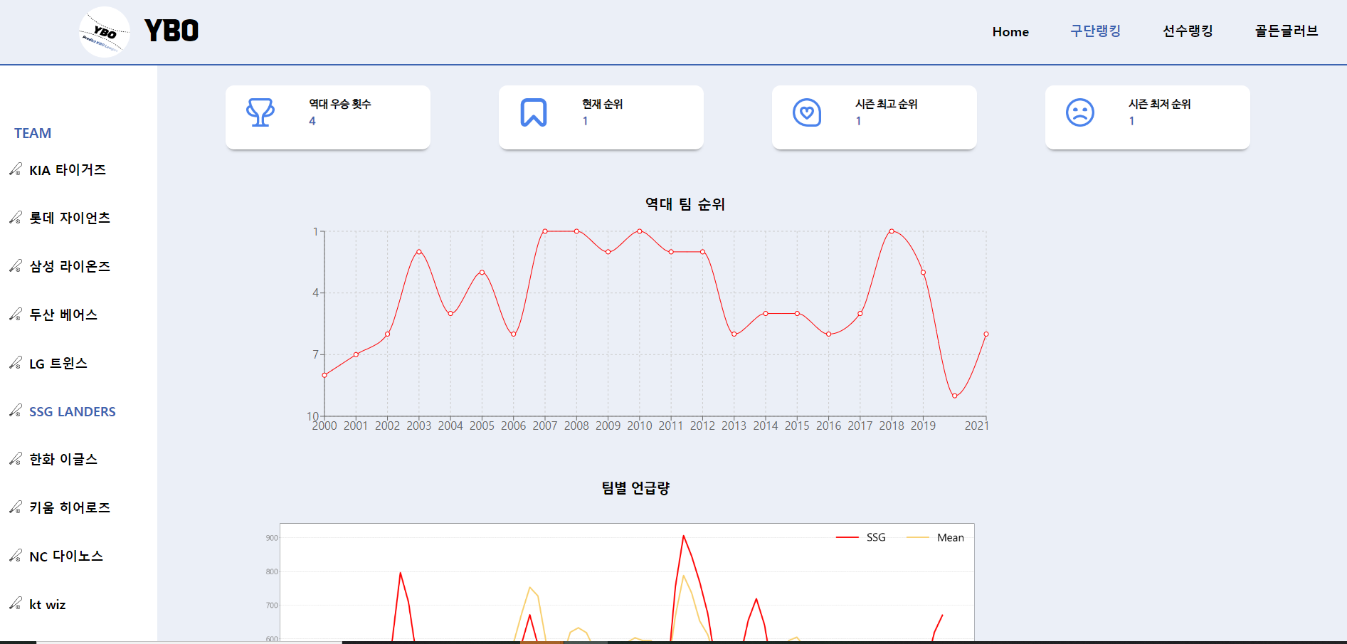 - 각 팀별 페이지를 만들어 팀 별 정보(우승횟수, 주전 등), NLP한 결과 (워드클라우드) 를 보여줌